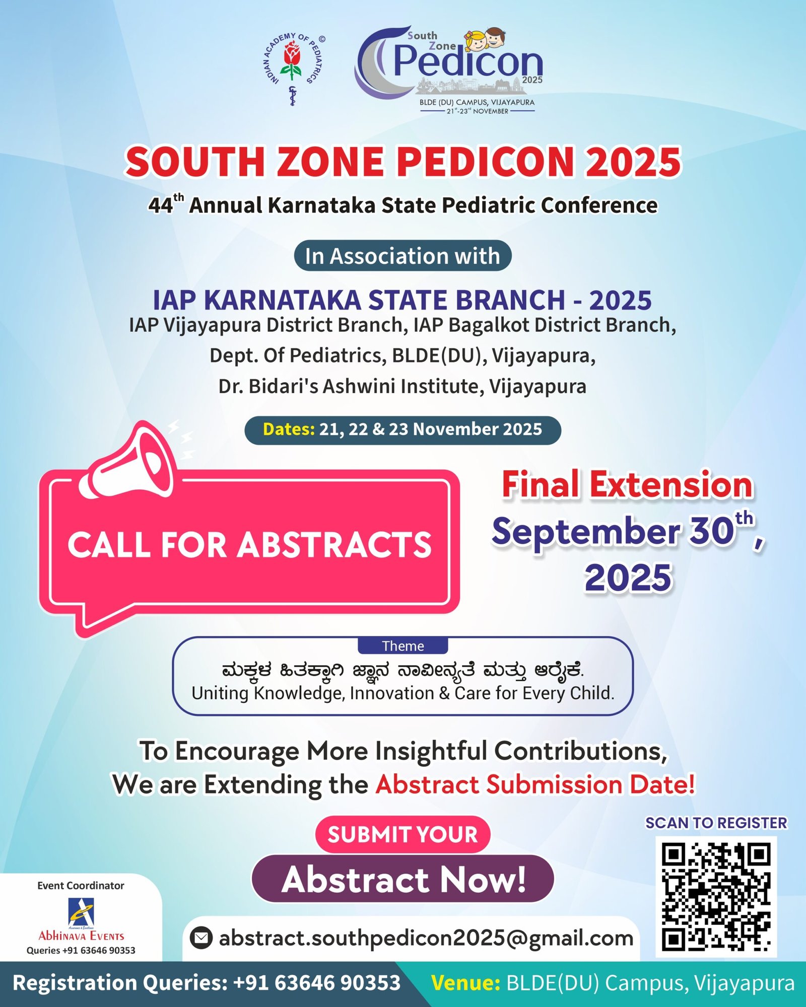 The Scientific Committee invites delegates who wish to give a presentation during SOUTH ZONE PEDICON 2025 in Vijayapura to submit their abstracts or full papers of scientific studies to abstract.southpedicon2025@gmail.com before September 30th, 2025.